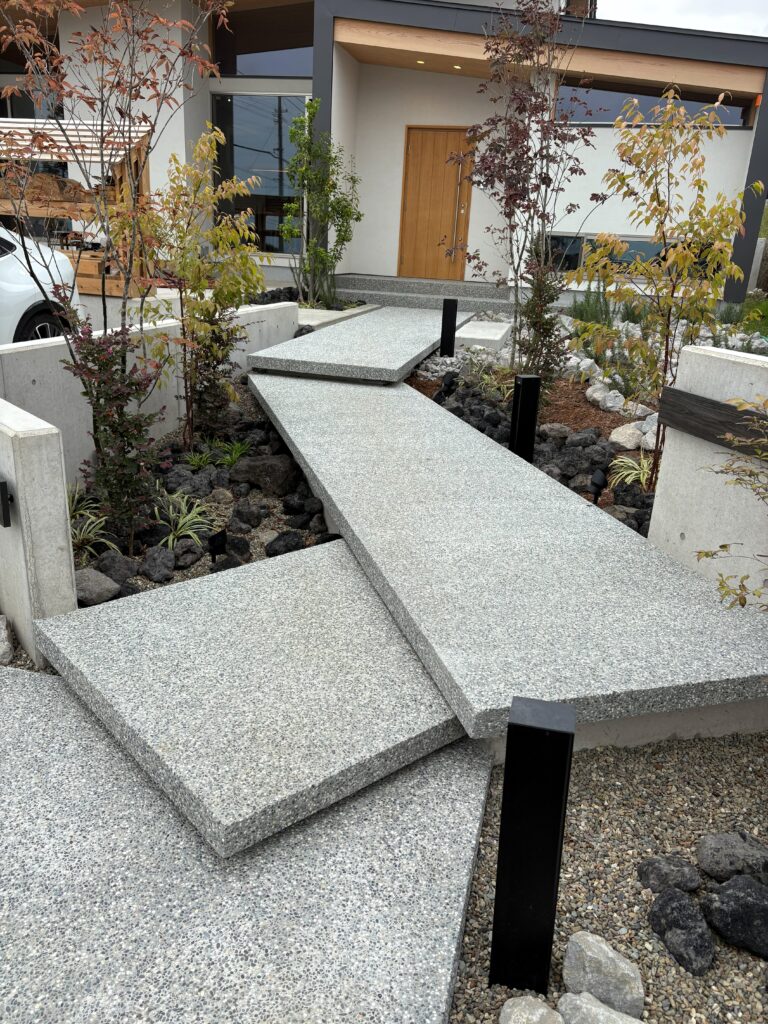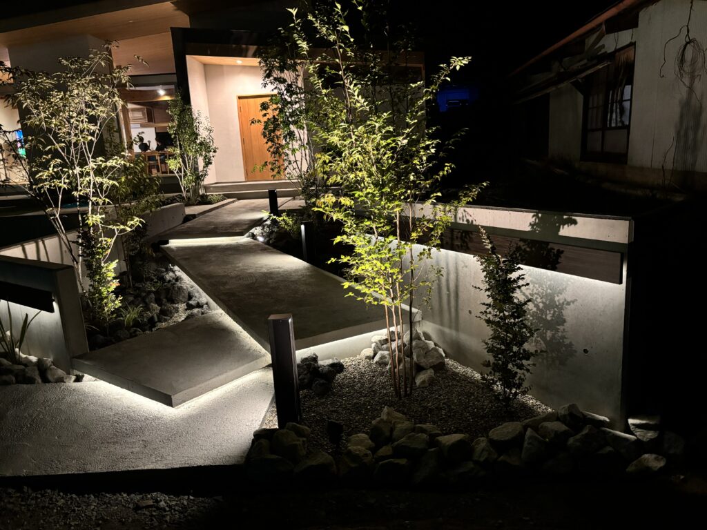 木のぬくもりと、安心が息づく大らかな平屋に似合うエクステリアとフロートステップを夜はガーデンライトで演出。ロックガーデン風のアプローチに合わせた浮き階段がラインライトで浮いているように見えるだけではなく、石が照らされて暖かみを感じられます。