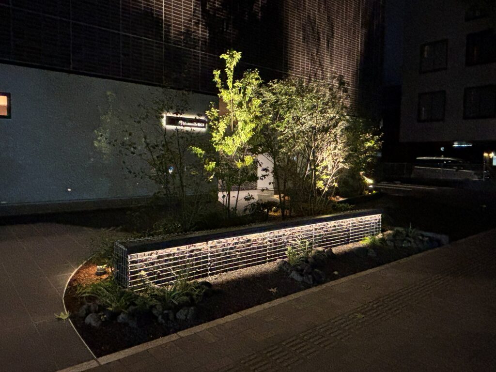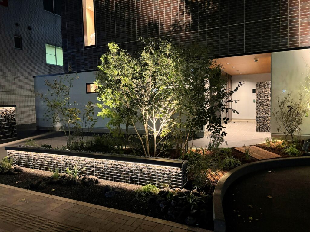 近年、駅前開発が盛んで、次々と新しい建物が誕生している駅前の通リに面したマンション建物の入り口まで少し距離を取ったアプローチは建物への圧迫感を軽減し、豊かな植栽で包み込み、重厚感漂うガビオンとの組み合わせで、自然な空間を演出してます。また、植栽とガビオンをライトアップすることで空間に奥行きが生まれ昼間とは違う夜の景色を楽しむことができます。