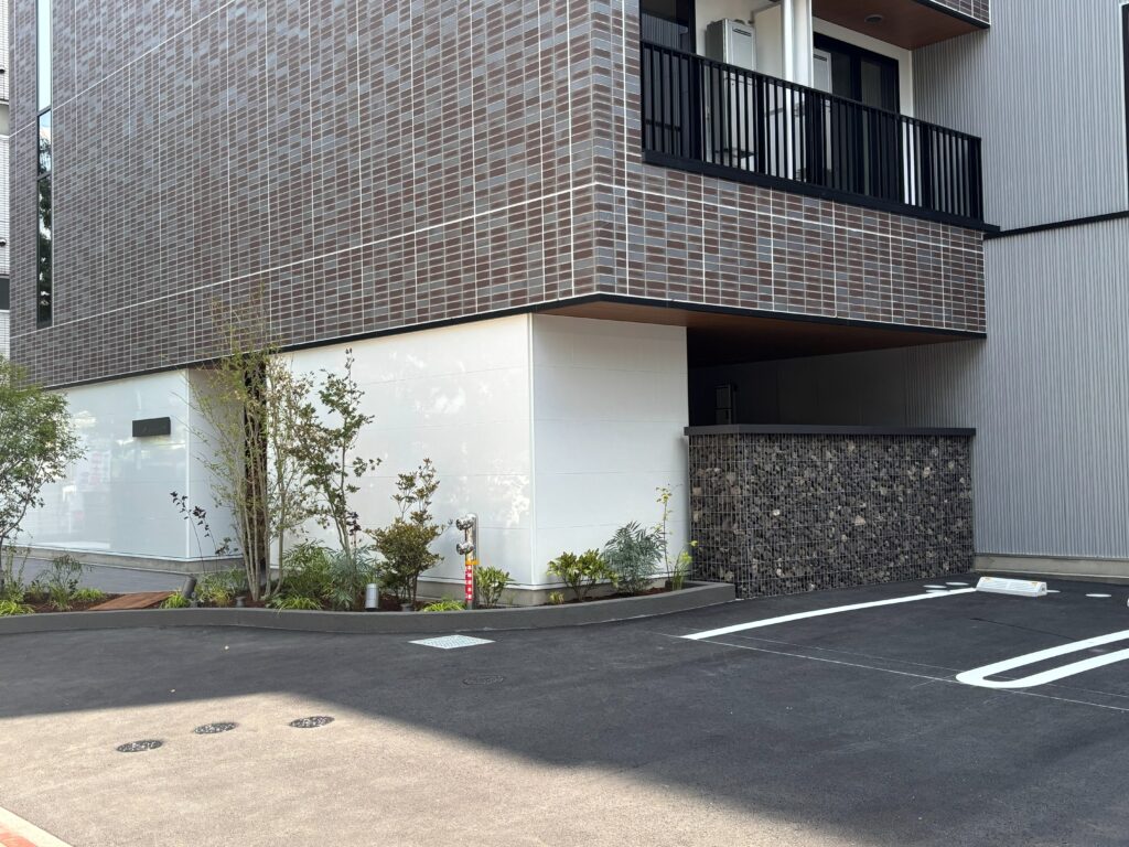 【企業・オフィス】自然と調和するガビオンウォールを用いたマンションファサード